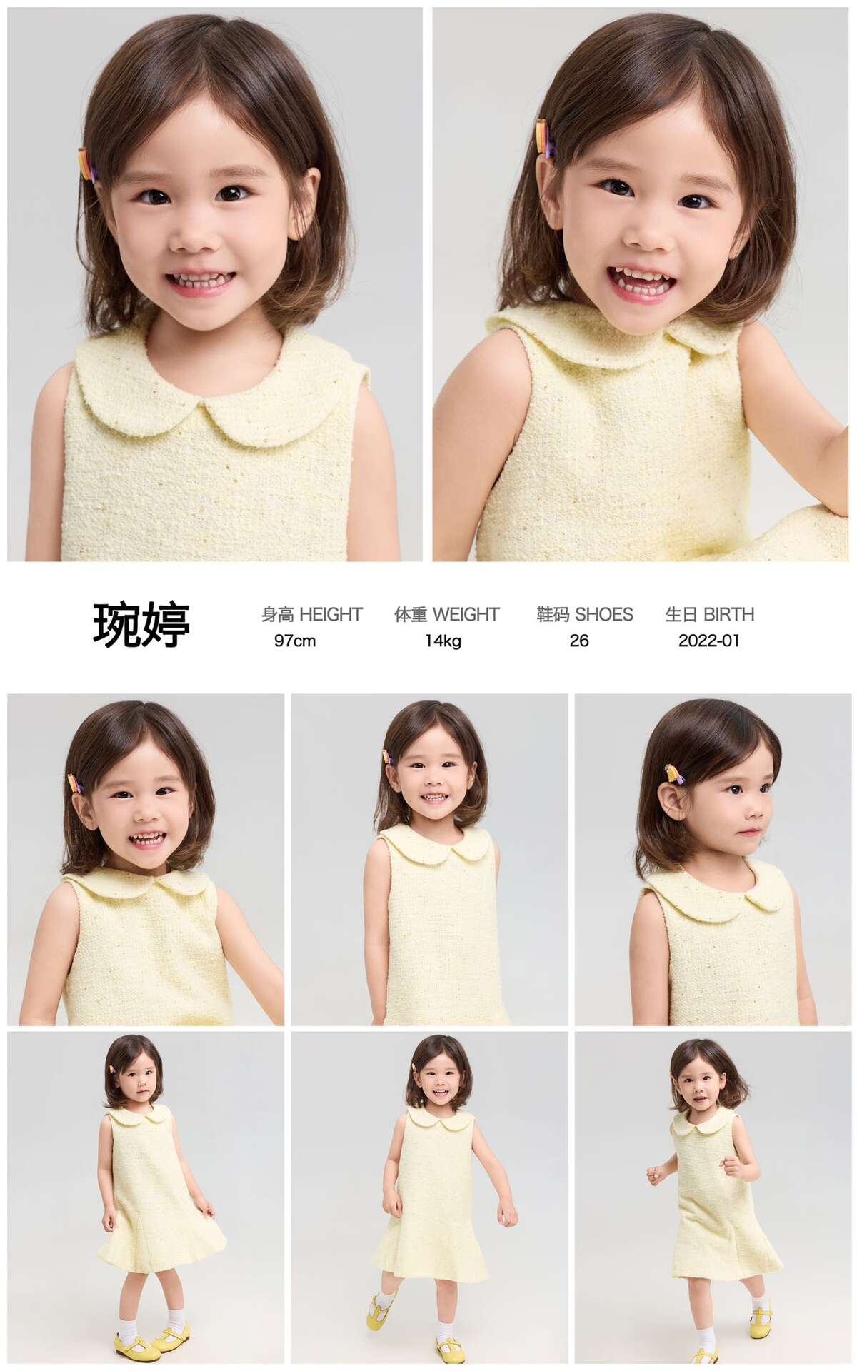 琬婷98cm 14kg 江浙沪 上海、成都 / 上海儿童成都 身高/height :98cm 体重/weight:14kg 年龄/age:4岁 城市/city:上海成都 特点:聪明伶俐,配合度高,各种风格,轻松hold住,天生会演,扮哭扮笑一秒入戏 Smart Cute Good at cooperation 编辑 取消关注 关注 私信 模 卡 自我介绍 暂无PDF资料 给TA打赏 共{{data.count}}人 人已打赏 上海儿童成都