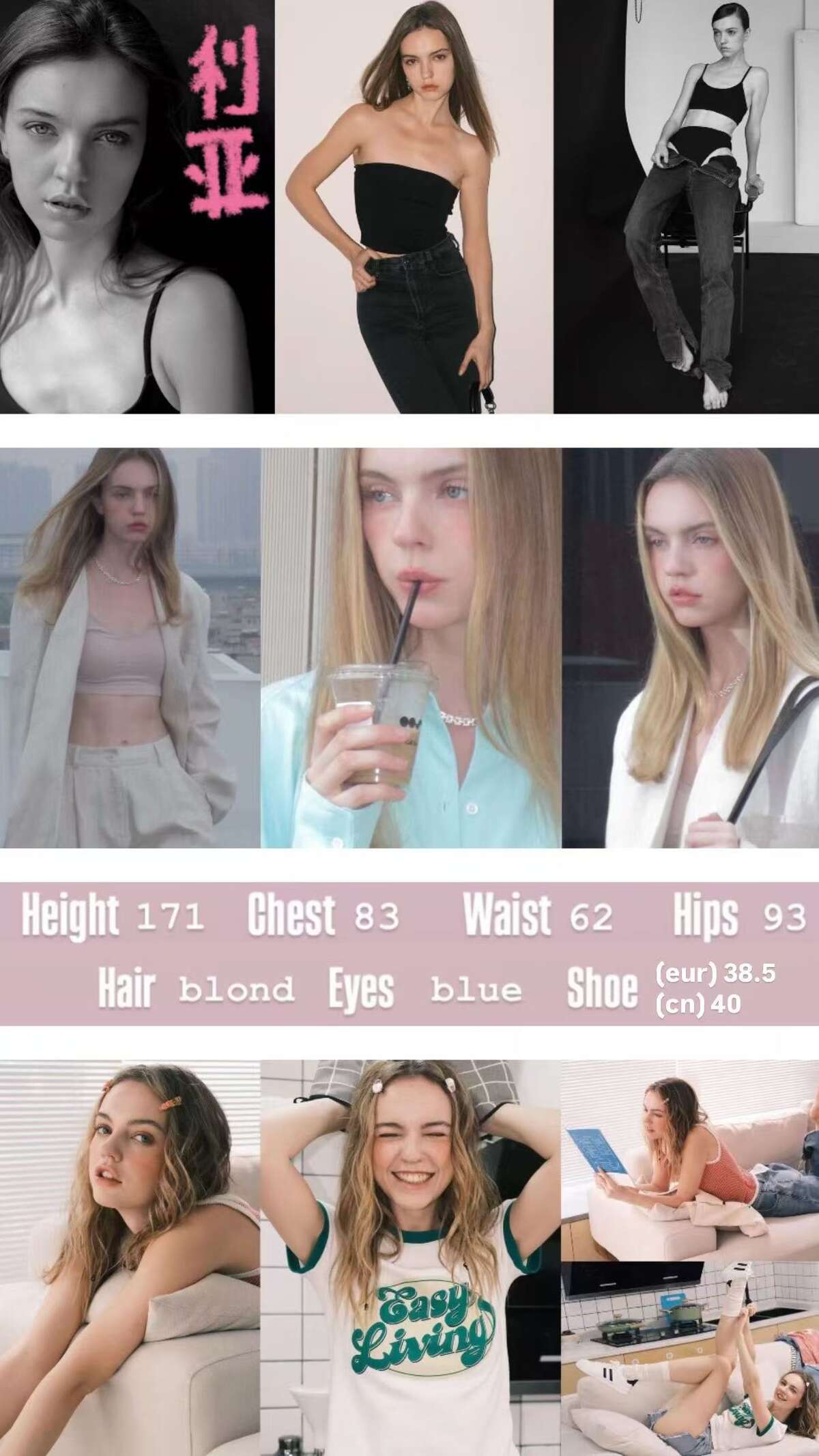 利亚171cm 83-62-93 40码 江浙沪 江浙沪 / 江浙沪青年外籍 EYES:BLUE; HAIR:BLOND 编辑 取消关注 关注 私信 模 卡 暂无PDF资料 给TA打赏 共{{data.count}}人 人已打赏 江浙沪青年外籍